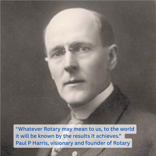 In February 1905, lawyer Paul Harris (then aged 37) and three friends met in a small office in downtown Chicago. These men wanted to rekindle in the turn-of-the-century city the spirit of friendliness they had known in their hometowns. Word of the club soon spread, and others were invited to join. They named their new club “Rotary” to describe the practice of meeting in rotation at the members’ various places of business.
